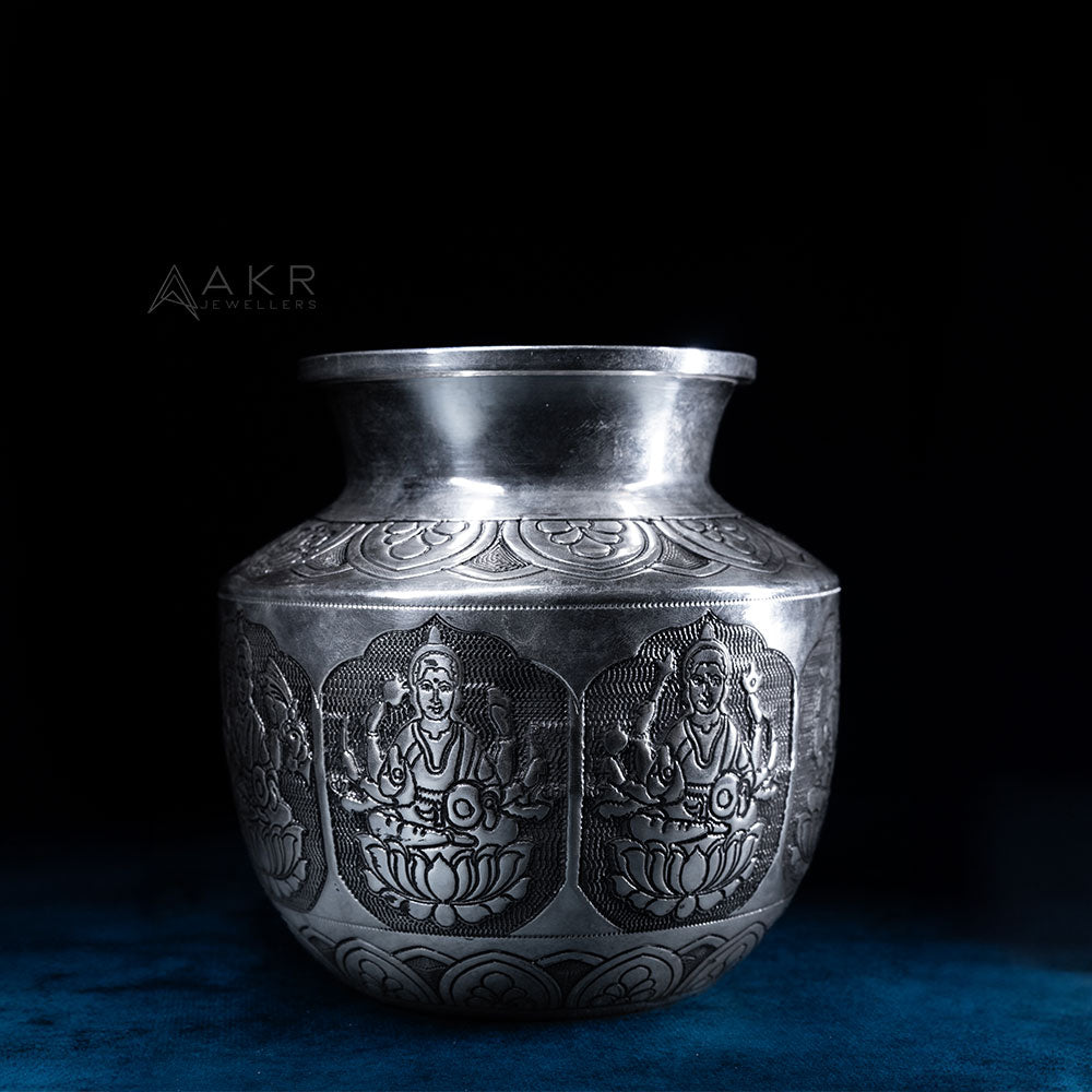 Made with 92.5% pure silver, this sacred Kalasham features the eight divine forms of Goddess Lakshmi. A symbol of wealth, fertility, and auspiciousness—ideal for pooja and gifting.