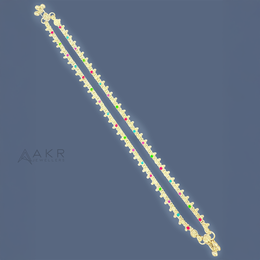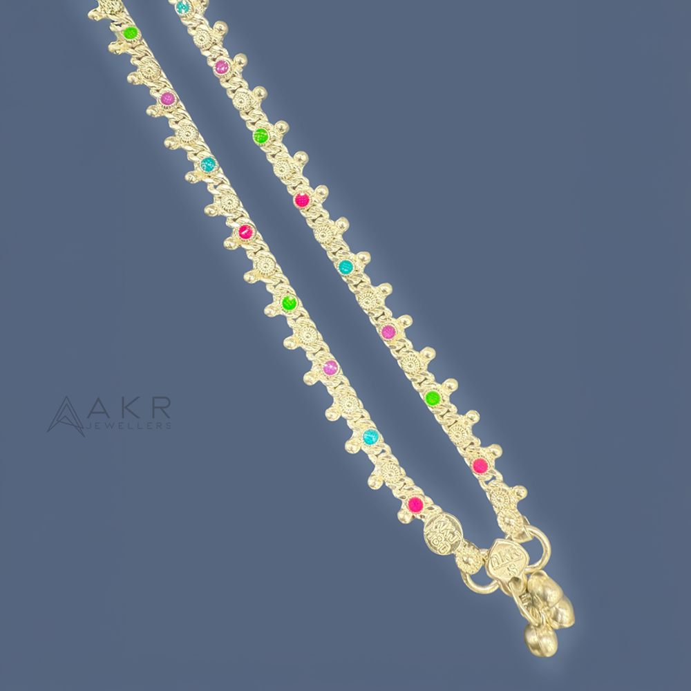 Delicate silver anklet with colourful stones and single-dotted design, ideal for traditional and festive occasions in multiple sizes.