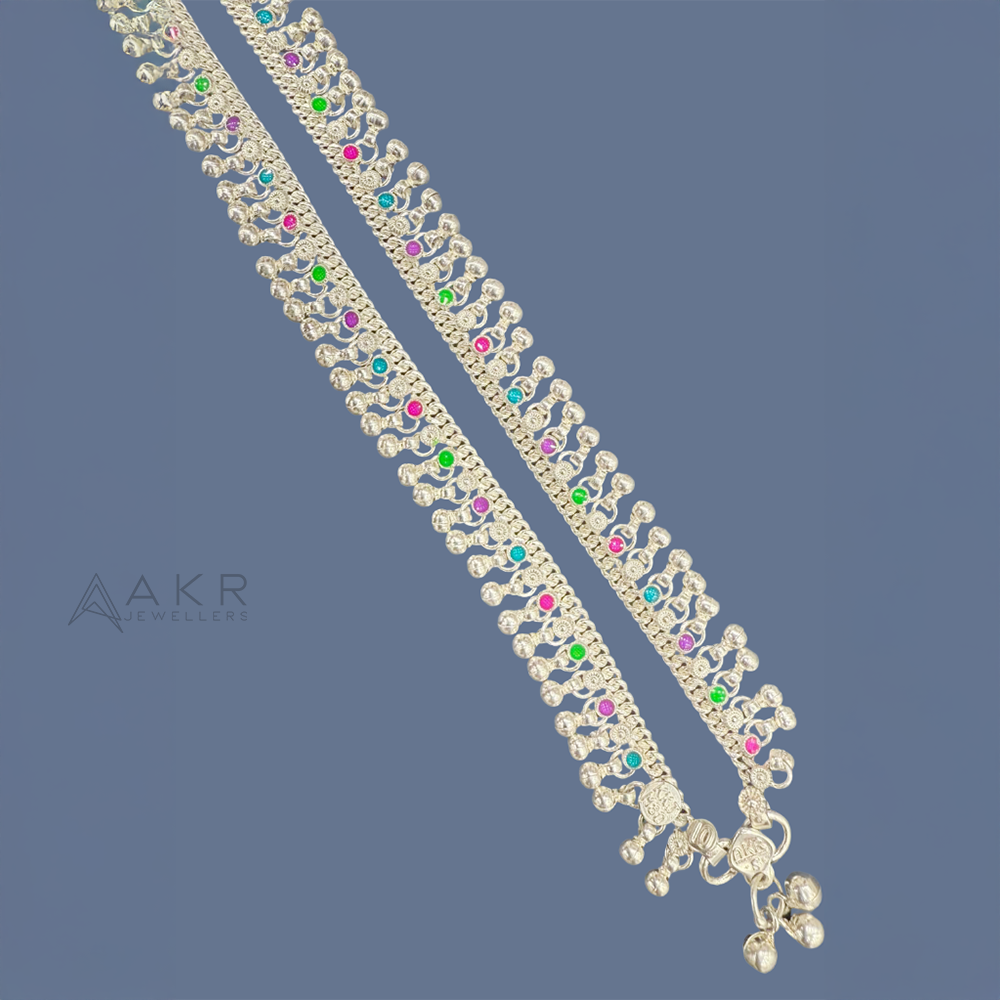 Elegant silver challa anklet adorned with multicolor stones, perfect for traditional wear, combining craftsmanship with vibrant detailing and charm.