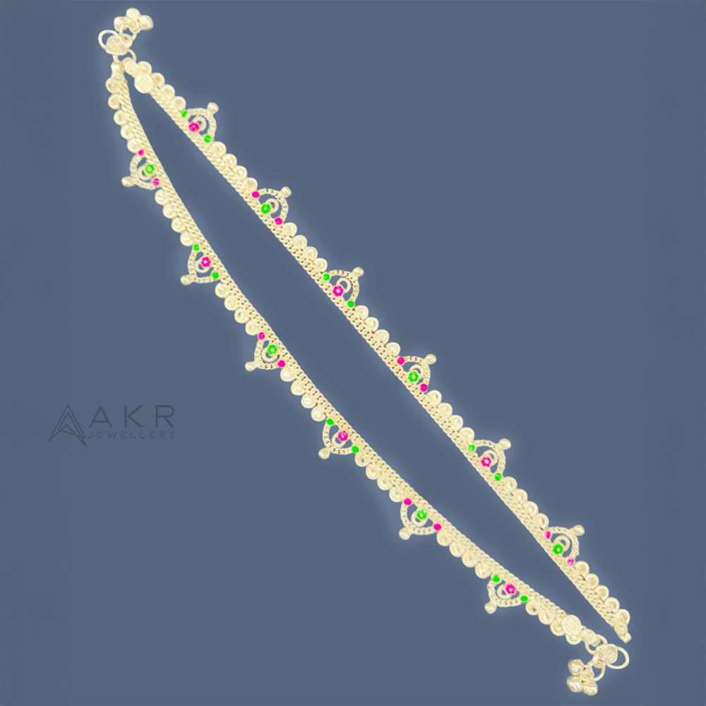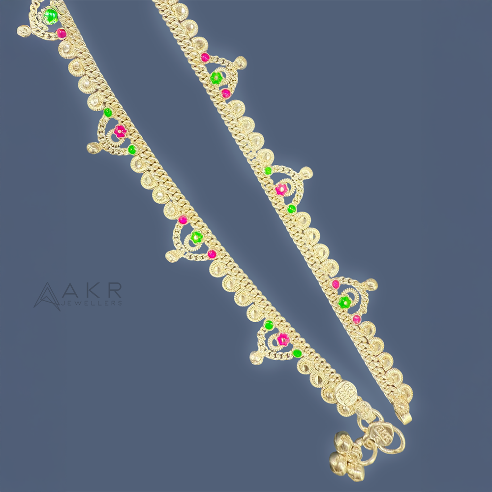 Loose Pinde Jalar anklets with intricate jalar design and colorful stone accents, ideal for festive and ethnic occasions.