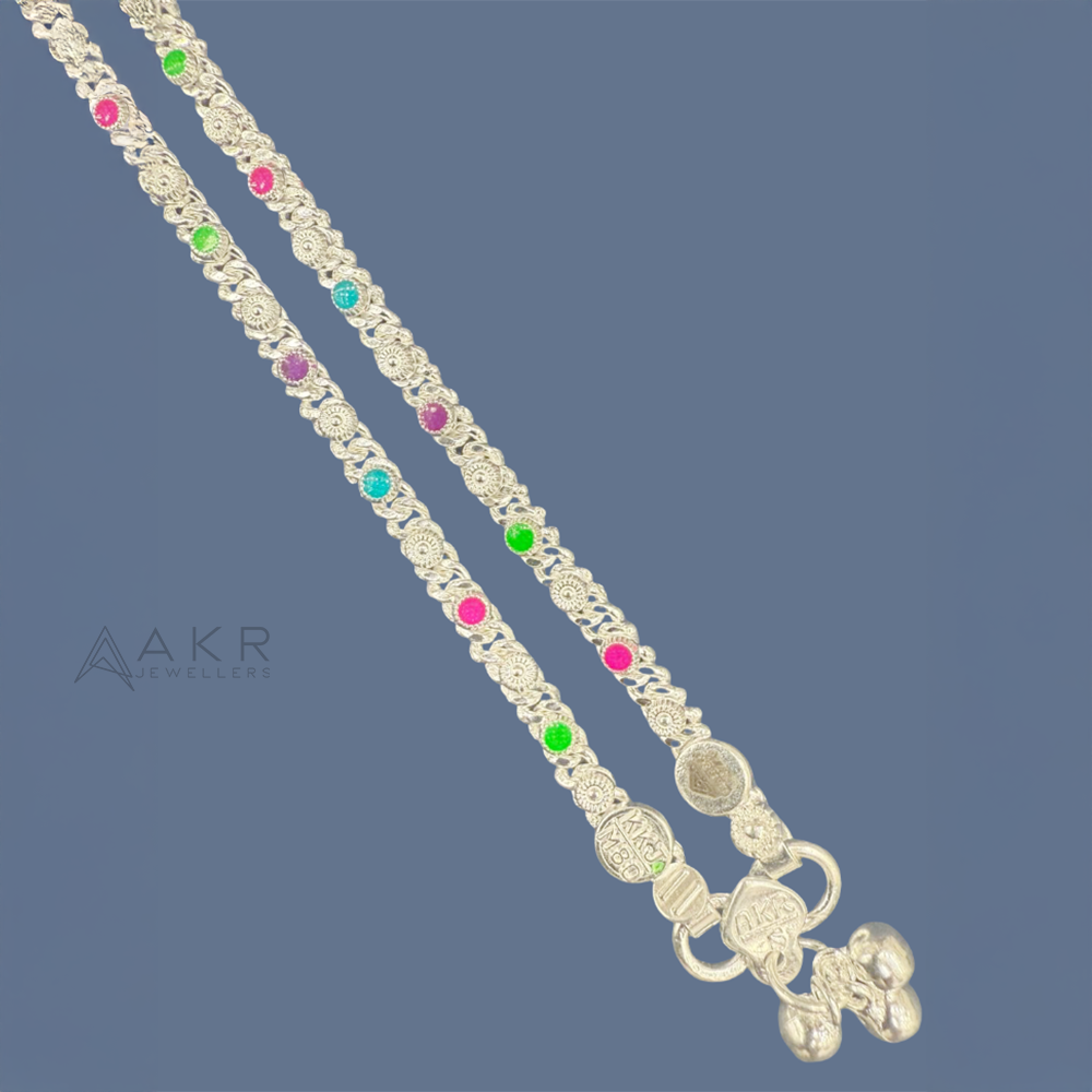 Stylish silver anklet with vibrant gemstones, intricate craftsmanship, and elegant finish, designed to enhance traditional and festive looks gracefully.