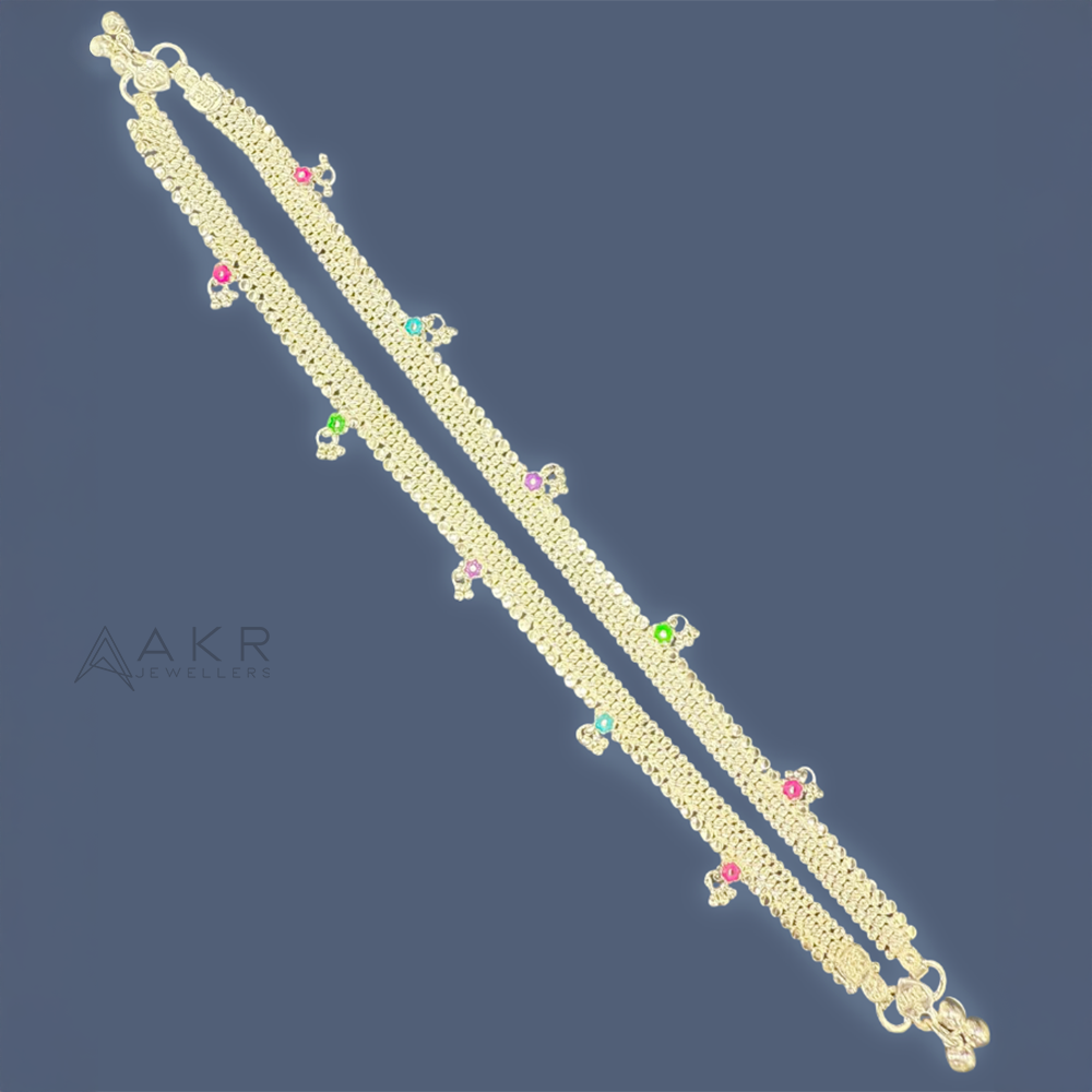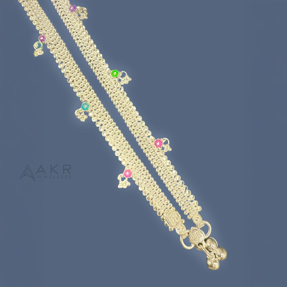 Stylish gold-finish anklet with colorful stones and intricate work, perfect for traditional wear with adjustable size options.