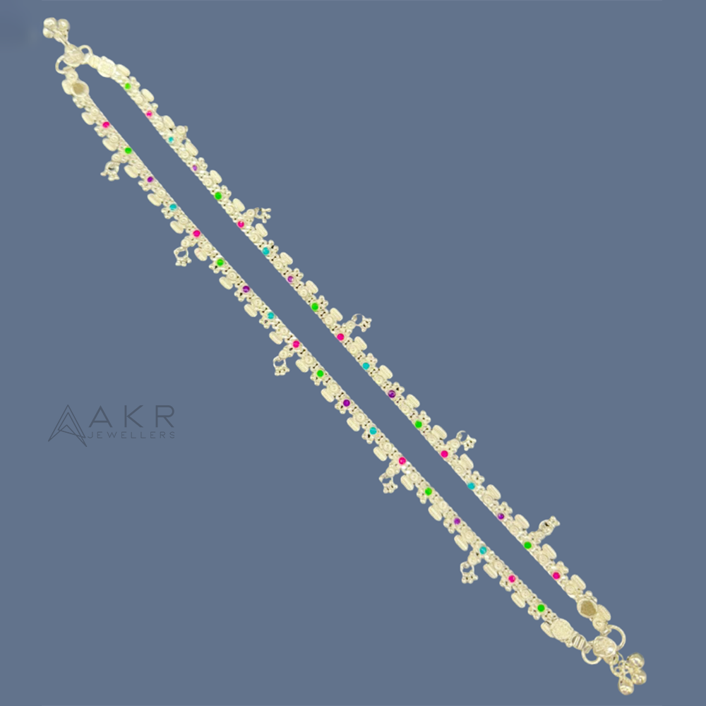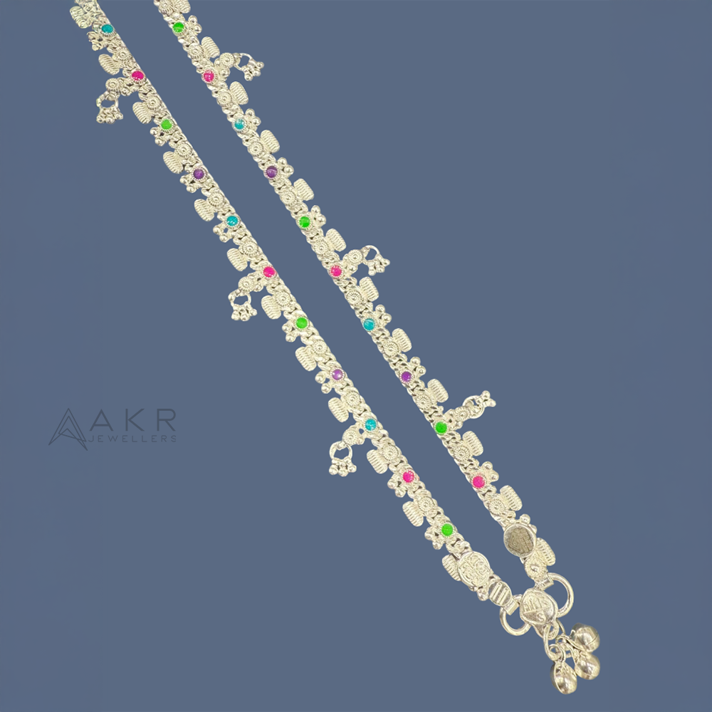 Intricate silver anklet with hanging charms and vibrant stones, combining elegance and tradition in a graceful, eye-catching design.