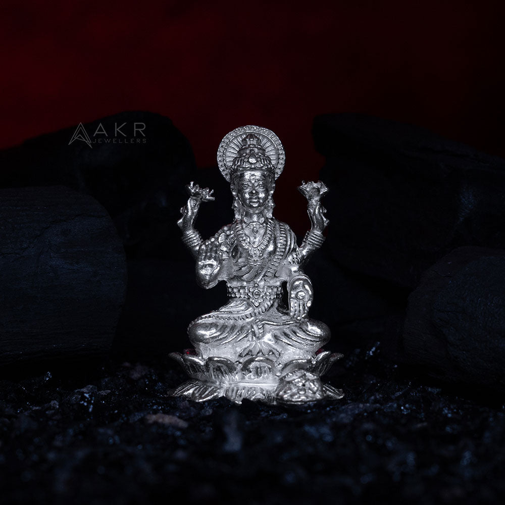 Grace your space with this elegant Lakshmi Devi silver idol from AKR Jewellery. Crafted in pure silver, it's perfect for pooja, gifting, and invoking blessings of wealth and prosperity.