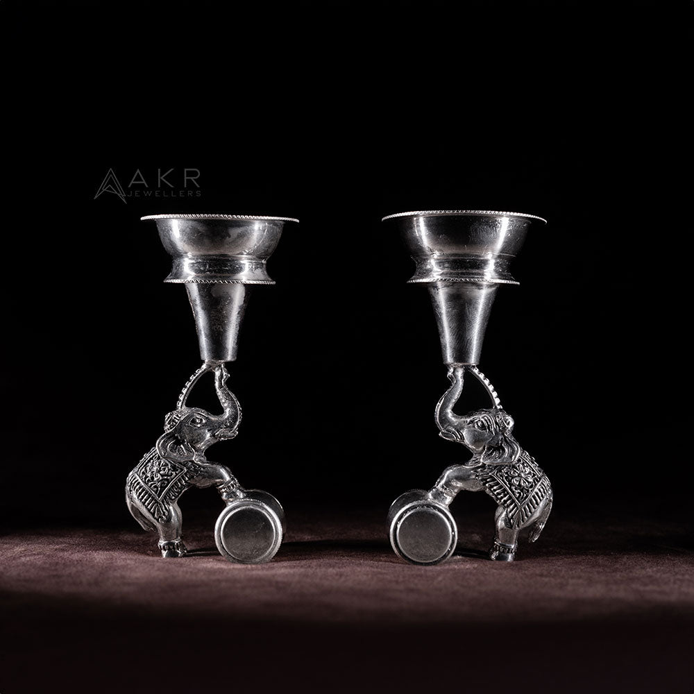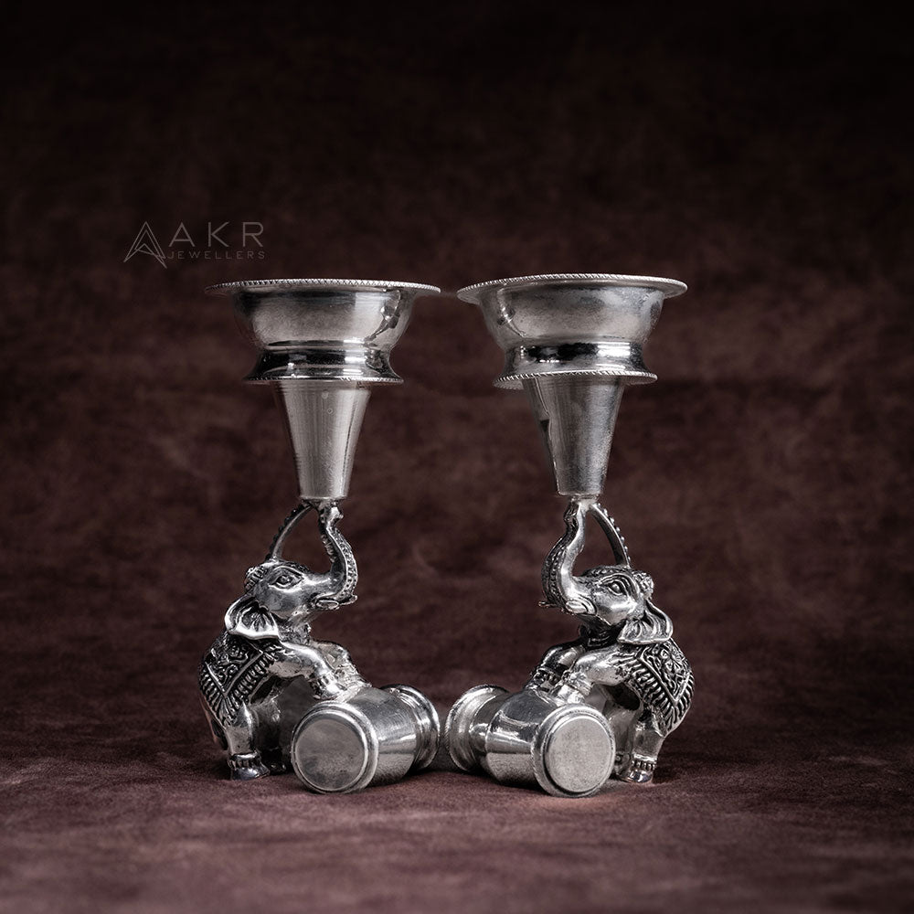 These intricately crafted Elephant Lamps, made from 92.5% pure silver, combine tradition and elegance. Perfect for pooja decor or gifting, they symbolize strength, prosperity, and divine illumination.