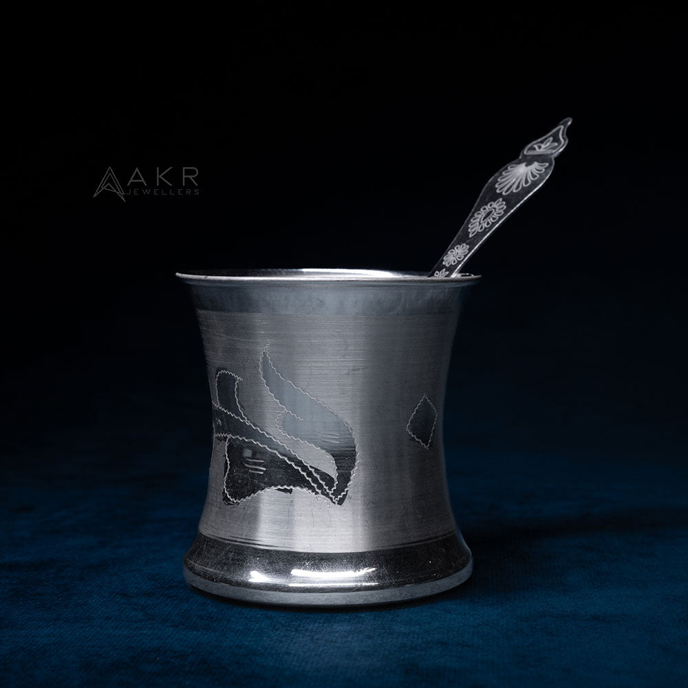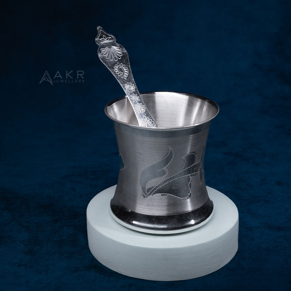 This finely crafted silver tumbler and spoon set from AKR Jewellers features delicate engravings, blending traditional artistry with practical elegance. Ideal for gifting or personal use, it embodies exquisite craftsmanship.