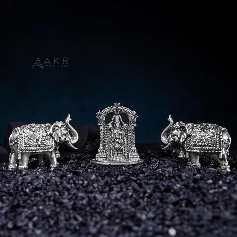 Includes intricately crafted Lord Balaji idol accompanied by a pair of majestic Elephant idols. -