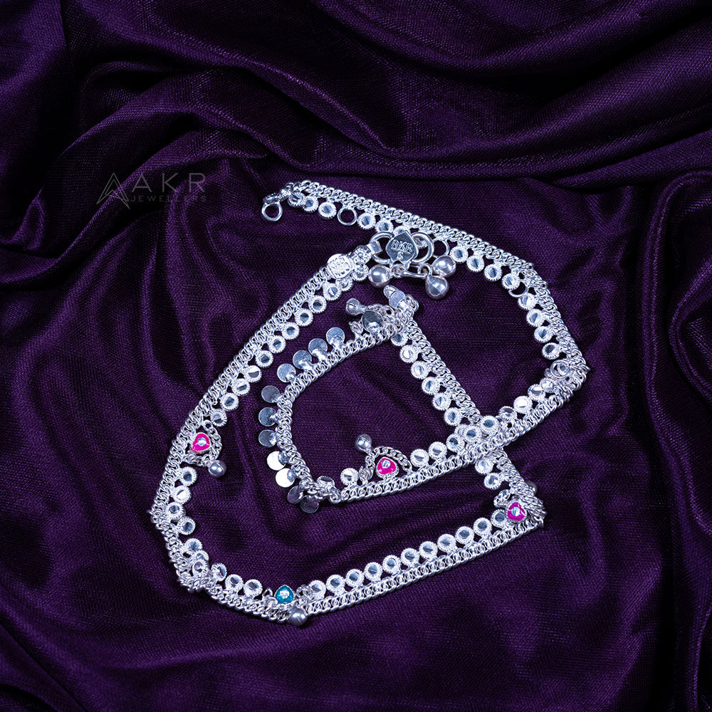Decorative Elements: Features small ghungroo (bells) and colored stone embellishments (pink, blue, etc.)
