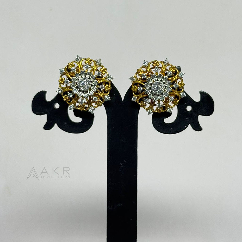Gold coating silver grand stud tops with intricate floral filigree, sparkling white stone cluster center, and ornate detailing. Weighing 10gm, perfect for weddings, parties, and festive occasions.